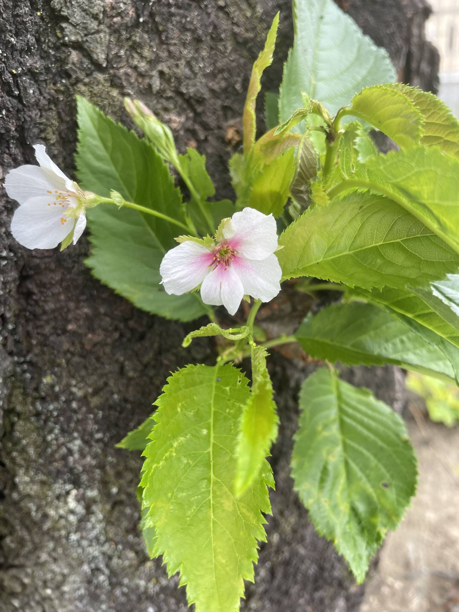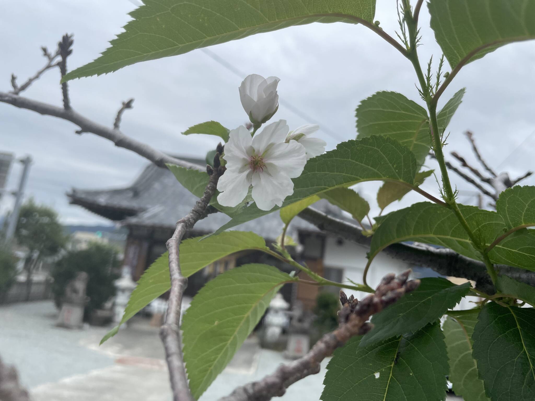 10月4日例大祭に参拝された方から「桜が咲いています!」と知らされました。確かに数か所に可憐な花が!暑い夏の間に葉は全て枯れて散ったのですが、気温がぐっと下がった今、ところどころに青々とした葉や開花が確認できます。お参りの際はぜひ季節外れの桜の花を見ていってくださいね!