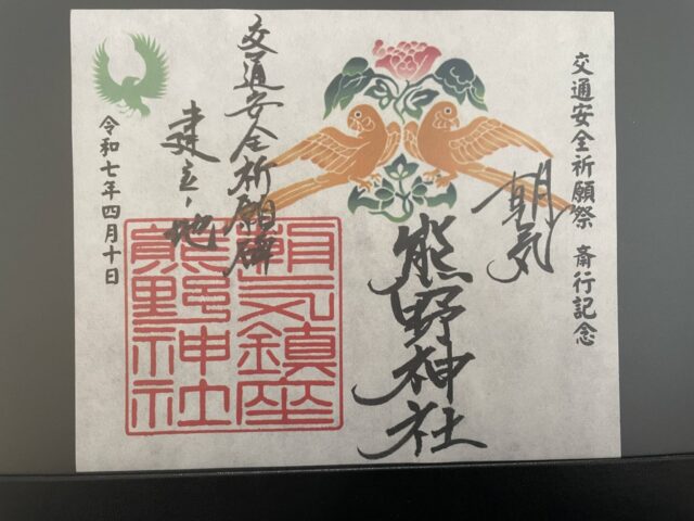 4月10日は春の交通安全週間中に執り行う交通安全祈願祭記念ご朱印を頒布します。図案は多種、画像は一例です。尚、中サイズとなります。