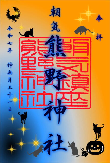 西洋版お盆のハロウィンご朱印、社頭にて頒布中。色の組み合わせは数種類あるので、お好みの1枚をお選びください。注:社名も印刷となります。